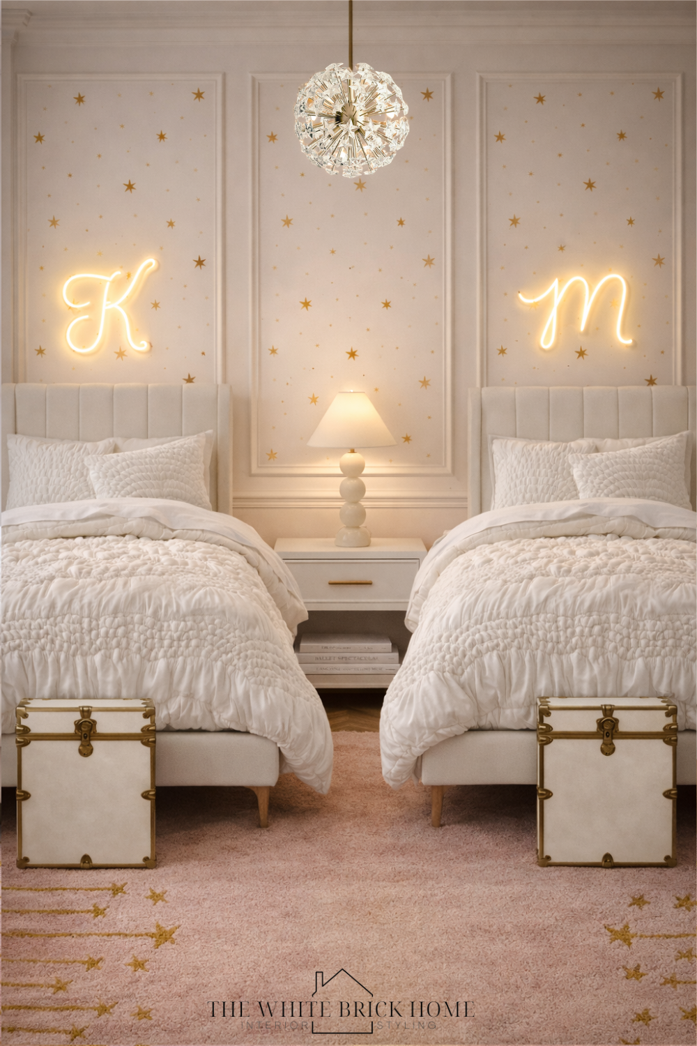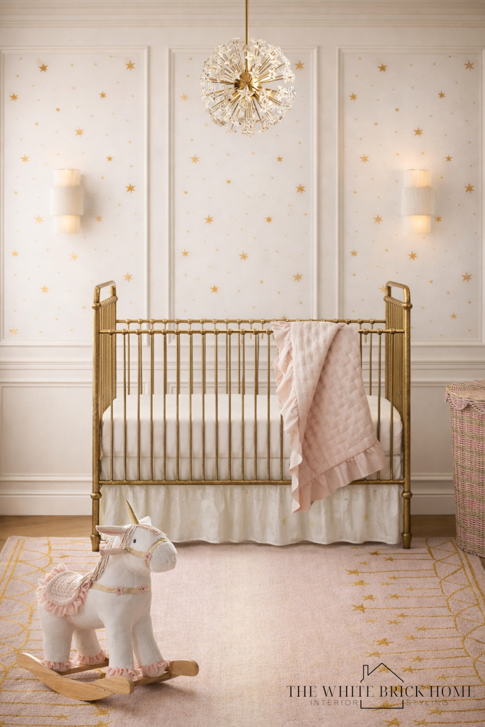 This collection of girls’ spaces was designed to feel soft, elevated, and effortlessly magical—layering blush tones, warm whites, and subtle gold details throughout each room. Inspired by ballet and brought to life with pieces from the Pottery Barn Kids x Tutu du Monde collaboration, every space blends whimsy with timeless design. From the glowing canopy bed with delicate tulle and fairy lights to the star-detailed wallpaper, heirloom-style lighting, and thoughtfully styled accents, each room was created to feel cohesive, feminine, and designed to grow beautifully with her.