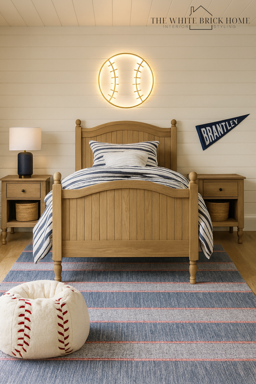 To elevate the space, choose furniture with a slightly rustic, all-American feel - think white oak or weathered wood paired - with simple brass or matte black hardware for a modern touch. Finish the room with warm lighting, a cozy area rug with subtle stripes or stars, and a few meaningful pieces like a personalized name sign, a shelf of favorite baseballs, or a scoreboard-style clock to create a space that feels both playful and polished.